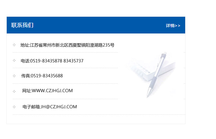 地址:常州市新北區友邦商務大廈1幢16、17層  電話:0519-85101652  傳真:0519-85112595  郵編:213022  網址:www.cz-jiayue_cn.vinock.com  郵箱:xiajifengaa@163.com